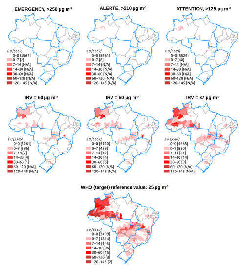A total of 309, 450 and 905 municipalities had mean PM concentrations exceeding, at least one day during the considered period, the intermediate reference values (established by the CONAMA 491/2018 resolution) of 60, 50, and 37 g m, respectively. A low number of municipalities exceeded, at least one day during the considered period, the alert thresholds established by the CONAMA 491/2018 resolution: 40, 8, and 2 municipalities for the attention, alert, and emergency levels, respectively (Figure 11).