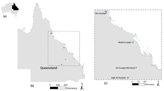 Map of the study sites in Queensland, Australia. (a) Australia (grey) showing the state Queensland (black). (b) Queensland with selected vegetation sites, area of interest in boxes shown in (c). (c) Northeast coastal region of Queensland with selected vegetation sites.