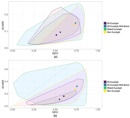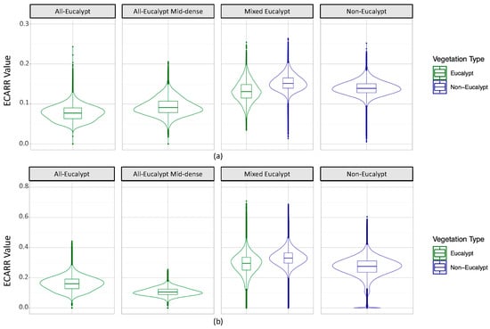Mean ECARR values in the non-eucalypt site were higher than both all-eucalypt sites in both sensor types (Table 4 and Figure 3). Surprisingly, ECARR values did not differ greatly between density structures; both “dense” and “very sparse” vegetation showed similar mean values (Figure S8). However, the “very sparse” vegetation is very small in geographic extent (<0.05% of pixels) and is surrounded by dense vegetation. It is possible that the satellite resolutions were too coarse to distinguish this very small area of sparse vegetation from its surroundings. There could also be boundary discrepancies between the VMRE map and the landscape that could have allowed for “dense” vegetation on the landscape to be classified in the “very sparse” area from the VMRE map.