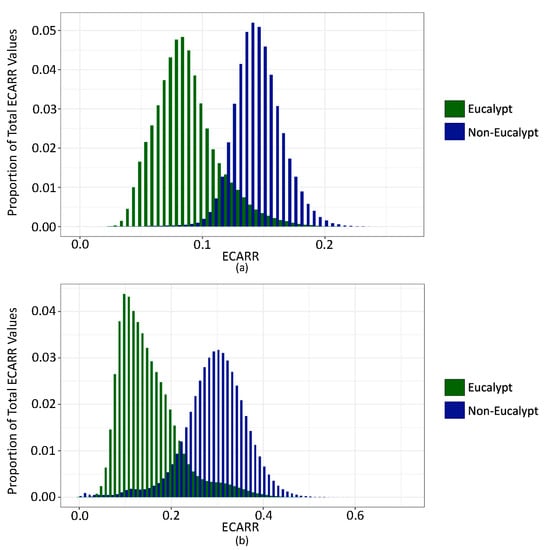 The substantial overlap of ECARR and NDVI value ranges across sites (Figure 9) further supports that the ECARR is sufficiently sensitive to identifying vegetation, but it cannot distinguish between vegetation types. However, the NDVI values (Figure 8c,g) were relatively high and consistent between the agricultural fields and the neighboring dense forest. This further promotes that the ECARR may emphasize reflective differences between chlorophylls in native vegetation and cultivated crops. We believe the high sensitivity but low specificity in ECARR’s ability to identify eucalypt vegetation is due to differences in the wide range of spectral wavelengths collected by these sensors and the original algorithm. The lack of specificity and low values from high-resolution imagery (3–20 m) suggest ECARR should not be used on the satellite data sources considered here to assess changes in eucalypt vegetation dynamics or biodiversity over time with confidence. The ECBRR is also not readily applicable to identify eucalypt vegetation remotely with high confidence from the satellite imagery assessed here. The algorithms alone, when applied to either source of imagery, do not provide enough information to classify the eucalypt vegetation extent.