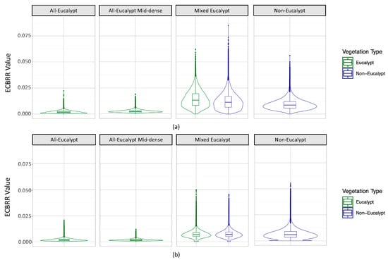 The distribution of ECBRR was not significantly impacted by site (Figures S20–S21), shown by the substantial overlap of the non-eucalypt and mixed eucalypt site value distributions across both satellite types. Regardless of the vegetation attributes, there was little separation between the maximum and minimum values across all sites, sensors, and seasons.