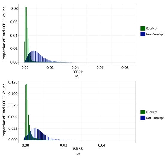 The mixed eucalypt site similarly contained pixels with the highest ECBRR values near the slopes of the Pelion State Forest hills and along boundaries between vegetation communities. However, the agricultural fields that were readily distinguished by ECARR (Figure 2c,g) are not as easily discernable and blend in with the nearby forest due to their similarly low ECBRR values. This implies that ECBRR cannot distinguish between the chlorophyll reflectance of native vegetation and cultivated crops. The non-eucalypt site contained higher maximum values of ECBRR in both types of satellite imagery than the large all-eucalypt site. Although the ROC curves indicated that ECBRR was sensitive enough to identify eucalypt vegetation in both types of imagery (Figures S15 and S16), the very low means and narrow ranges of ECBRR suggest other spectral indices, such as ECARR or NDVI, are better at identifying vegetation remotely and offer more separation in values between vegetation and nonvegetation in satellite imagery.