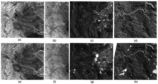 Results of the Eucalypt chlorophyll-b reflectance ratio (ECBRR) calculations shown with a gradient color scale from white (low) to black (high). Panels (a–d) show Sentinel-2 imagery. Panels (e–h) show Planet imagery. (a) All-eucalypt site ECBRR results Sentinel-2A imagery. (b) All-eucalypt mid-dense site ECBRR results Sentinel-2B imagery. (c) Mixed eucalypt site ECBRR results Sentinel-2A imagery. (d) Non-eucalypt site ECBRR results Sentinel-2B imagery. (e) All-eucalypt site ECBRR results Planet imagery. (f) All-eucalypt mid-dense site ECBRR results Planet imagery. (g) Mixed eucalypt site ECBRR results Planet imagery. (h) Non-Eucalypt site ECBRR results Planet imagery.