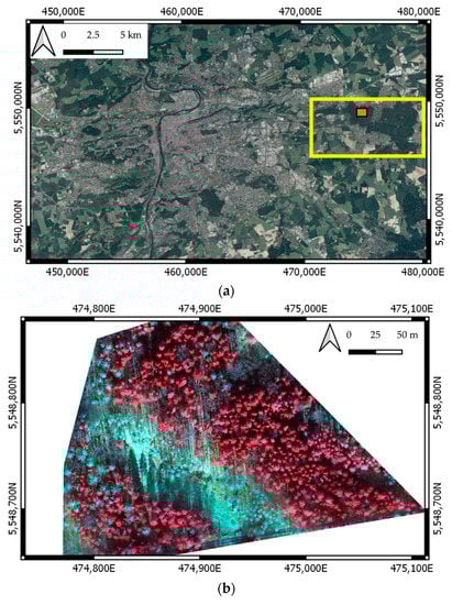 Study area. (a) Location of Klánovice forest (yellow rectangle) and study area (orange rectangle) in Prague metropolitan area, (b) Study area on a multispectral image. The coordinate reference system is WGS 84/UTM zone 33N.
