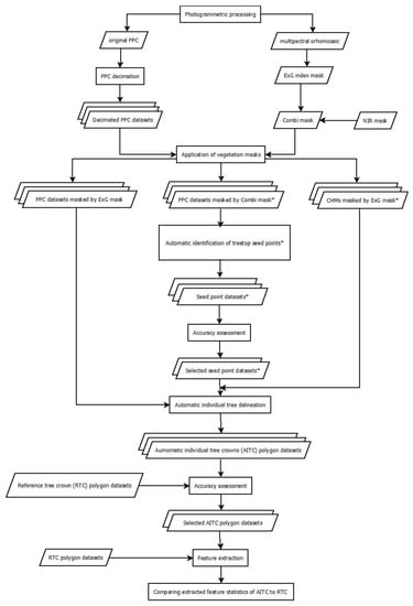 The processing workflow suggested in this study. Steps marked with * are optional regarding to used ITCD method. These steps are necessary for Dalponte2016 and Marker controlled watershed segmentation methods in this study.