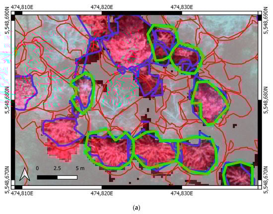 The effect of vegetation mask application before the LI segmentation technique to the PPC is illustrated in Figure 3. The mask’s application resulted in a perfect reduction in deciduous tree crown segments and the better delineation of the disturbed trees.