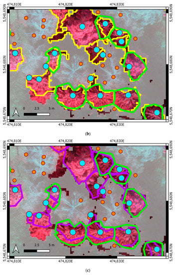 The results of vegetation masks application before the ITCD in the detail: (a) The LI segmentation method applied to point cloud directly. Segmented crowns using the ExG mask are highlighted in blue. Segmented crowns using no mask are highlighted in red. Reference crowns are highlighted in green; (b) The MCWS segmentation method using seed points. The seed points are segmented in light blue. The identified treetops from PPC with no mask are highlighted in orange. Segmented crowns are highlighted in yellow. Reference crowns are highlighted in green; (c) The DAL segmentation method using seed points. The seed used points masked by combi mask in light blue. The identified treetops from PPC with no mask are highlighted in orange. Segmented crowns are highlighted in purple. Reference crowns are highlighted in green.