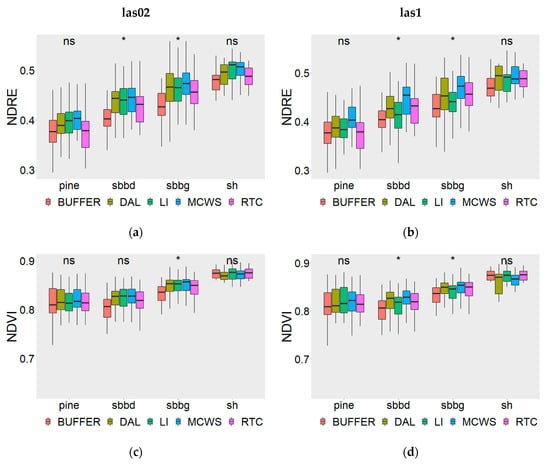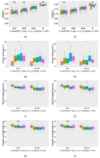 In addition, to the standard geometrical accuracy assessment of segmentation methods described in the Section 2.5.3, the extracted spectral and elevation features using AITC segments of DAL, MCWS, and LI were statistically compared to the extracted statistics of RTC (treatments versus control). The feature extraction was performed only for the most accurate las02 and the most inaccurate las1. Moreover, we added for comparison a simple buffer (BUFFER) method designed by authors that created buffer zones around the respective treetops. To consider the effect of different tree sizes, we applied circular buffers covering 3.14 m2 (1 m perimeter) or 12.56 m2 (2 m perimeter) for small and large trees, respectively. The buffer’s size was set according to the descriptive statistics for the height threshold of 27 m used in LI to distinguish between small and large trees. For all selected features, we applied a Kruskal–Wallis test followed by treatment (DAL, MCWS, LI, and BUFFER) versus control (RTC) multiple comparisons test of extracted statistics to investigate the effect of different segmentation methods and PPC decimation to the purity of crown delineation and the presence of mixels [72].