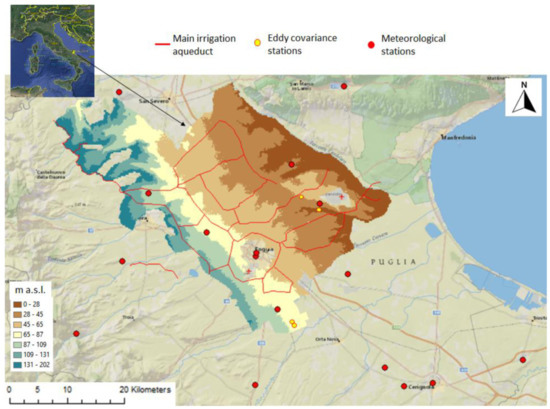 Figure 1) and delimited by the Apennines on the west and by the Gargano Promontory on the east side. It covers an area of about 65,000 hectares. Forty-five per cent of the total area is irrigated through the Consortium water distribution network (56,700 ha), while the remaining areas are irrigated with private wells [