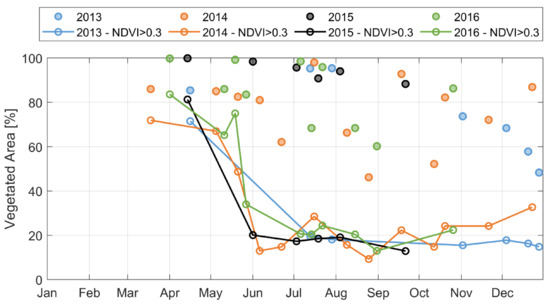 Figure 3). In fact, wheat is not irrigated and it is harvested at the beginning of June. Hence, the cultivated areas that are irrigated are about 40 % of the whole area during summer. Similar results are obtained for all the four analysed years.