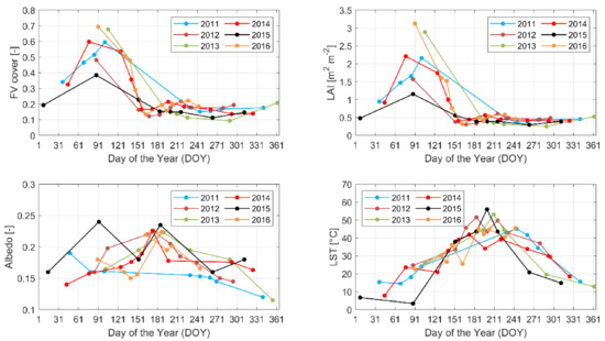 Figure 4 shows the behaviour of those variables for the period 2011–2016 averaged over the whole Capitanata area (e.g., case study area). The evolution shows FVC and LAI peaks on winter and until the beginning of April, which is expected, as this period is the most intensive cultivation time. Regarding the albedo, the highest values are during the May–June period, which coincides with the wheat ripening. Then of course, the LST peak values are between June and August.