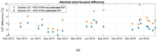 Figure 6a these differences pixel by pixel between LANDSAT LST and the calibrated and not calibrated RET are shown, highlighting the improvement in the LST estimates after the calibration. In