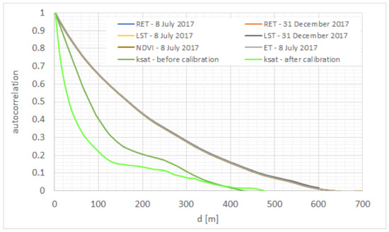 Figure 10, as an example, the autocorrelation function is also reported for the saturated hydraulic conductivity ksat, which has been previously calibrated. AC of ksat was less correlated than LST with lower values of AC, as expected. In fact, the soil structure variability is in general independent from the fields shapes and the available information are at a lower scale than the 30 m of resolution of the satellite data. After the pixel by pixel calibration procedure of the FEST-EWB model, the autocorrelation of ksat is correctly increased.