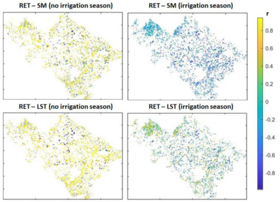 Table 3). As expected high correlation is found between modelled variables, which derives from the interconnected water–energy balances equations. Hence, high correlation (0.75–0.6) is obtained between RET and ET and SM, respectively, during the winter season; while during the irrigated season (e.g., from April to September) the variables are negatively correlated, as expected. Similar correlations are also found between LST from remote sensing the modelled ET and SM, confirming the goodness of the FEST-EWB model in reproducing the LST temporal variability. The high spatial correlation between the modelled SM and respectively the LST and RET is shown in
