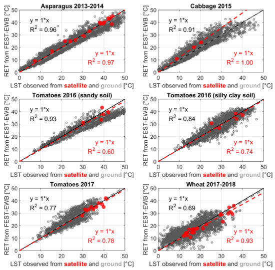 Similar results are obtained from the comparison between RET and LST from satellite data in the station pixel with m and R2 around 0.9–1, except for the two tomato fields during 2016 with R2 around 0.4. This may be due to the very few numbers of available satellite images.