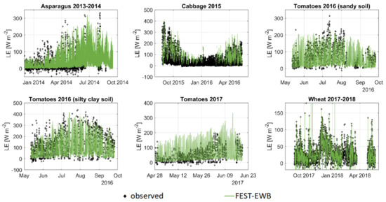 Figure 15, observed and modelled latent heat fluxes are shown for all the analysed fields, showing a good correspondence. Ground data have some missing values due to the correction procedures applied to eddy covariance data (paragraph 2.4). As observed for SM, FEST-EWB is able to correctly reproduce LE under different irrigation regimes and season of the year. In particular, low LE is correctly modelled during winter time for the cabbage and wheat fields, while very high LE is computed during the summer period for the tomato fields.