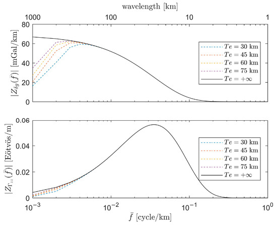 (top) The theoretical gravitational admittance; (bottom) The theoretical gravity gradient admittance. Scale at bottom in frequency and at top in wavelength. The solid curve is for the isostatically uncompensated model (). The dashed curves are for the regionally isostatically compensated model with respect to different effective elastic thickness of the plate .