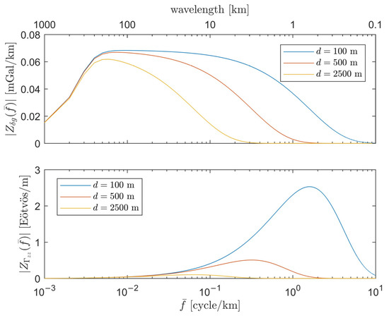 The theoretical gravitational admittance (top) and gravity gradient admittance (bottom) with respect to mean sea depth .