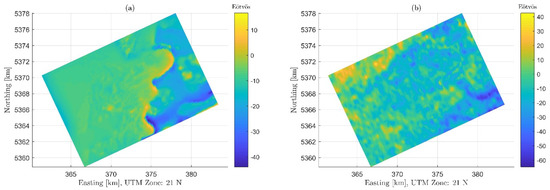 Figure 6b shows that experiment No. 1 recovers the general shape of the seafloor topography, including the sharp drop at 375 km Easting, the 2-km-wide Y-shaped trough system at the southeast corner and its 0.8 km wide branch at km [378.5, 5365]. Considering the typical resolution of airborne gravimetry is 2 km (capable of recovering topographic features with wavelength longer than 4 km), it is shown that the airborne gravity gradient is capable of recovering shorter-wavelength topographic features than gravity disturbance. However, the estimation error is as large as m. This is because the airborne gravity gradient measurements used in this study were conducted for geologic purposes in areas with complex sub-topography geologic structures, where the assumption of uniform density does not hold. The large non-terrain effects (22 Eötvös RMS, mainly due to sub-seafloor density variations) prevents experiment No. 1 from achieving high estimation accuracy. This experiment highlights the need to remove the non-terrain effects. Note that this is not the drawback of the airborne gravity gradiometry. In seafloor topography estimations using gravity disturbance, the non-terrain effect is one of the largest error sources too [22,28].