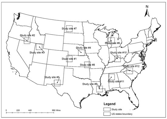 Landscape characteristics were assumed to impact the positional effect. Therefore, twelve study sites representing varied landscape conditions were selected within the conterminous United States through stratified random sampling (Figure 1). The sampling procedure was performed as follows. First, a fishnet composed of 197 square grids was created completely within the conterminous United States, and the extent of each grid was 180 × 180 km, nearly the same size as a Landsat scene []. Second, the landscape shape index (LSI), measuring overall geometric complexity of the entire landscape, was calculated for each grid based on the NLCD 2016 product (level II classification scheme, Table 3) [,] using Fragstats v4.2. Fragstats v4.2 is a software widely used for analyzing landscape metrics for categorical maps []. Third, the 197 square grids were stratified into seven strata using the LSI as an indicator: LSI < 200, 200 ≤ LSI < 300, 300 ≤ LSI < 400, 400 ≤ LSI < 500, 500 ≤ LSI < 600, 600 ≤ LSI < 700, LSI ≥ 700. Stratified random sampling was implemented with a sample size of 12. The sample size within each stratum was proportional to the number of grids in that stratum. Twelve study sites were sufficient to represent the landscape characteristics of the conterminous United States because these study sites account for over 6% of the sampling population (197 grids) and each strata had at least one sample. The twelve study sites were renamed from #1 to #12 according to the LSI value from small to large (Table 4).