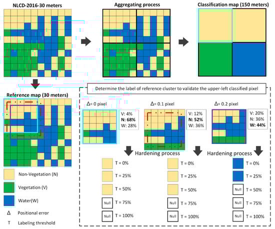 In the simulation analysis, the positional error  was varied from 0 to 2 pixels in increments of 0.1 pixels. The positional error model was applied to every pixel in the classification map and its corresponding cluster in the reference data. Different labeling thresholds (T) were selected to determine the label of a cluster in the reference data: 0%, 25%, 50%, 75%, and 100%. This research included the threshold of 0% to simulate the scenario in which the simple majority rule was applied to determine the label of a reference cluster []. Figure 2 takes the upper-left classified pixel as an example to show how to determine its reference label based on the multiple classes within the cluster due to the positional errors and various labeling thresholds. The spatial resolution of the classification map is 150 m, while that of the reference map is 30 m. The upper-left pixel in the classification map was classified as non-vegetation, but its reference cluster contained multiple classes. The figure presents the steps to determine the label of this reference cluster. If the positional error () was set to 0 pixels, then the proportions of vegetation, non-vegetation, and water within the reference cluster would be 4%, 68%, and 28%, respectively. Therefore, non-vegetation is the dominant class. The reference label was determined as non-vegetation because its proportion in the reference cluster is greater than the labeling threshold (T). If the dominant map class is less than the labeling threshold (T), the reference label is specified as null. In the example in the figure, the reference cluster’s label was specified as non-vegetation when the threshold was set to 0%, 25% or 50%, and null when the threshold was 75% or 100%. This sampling unit (reference cluster) would be abandoned if it was labeled as null. The same calculation was applied to the reference cluster when the positional error was 0.1 pixels and 0.2 pixels, respectively. The labeling result was the same when the positional error was 0.1 pixels, although this amount of positional error slightly changed the class’ proportions. The result was completely different when the positional error reached 0.2 pixels because the dominant class became water with a percentage of 44%. Consequently, if a labeling threshold of 0% or 25% was applied, the reference cluster was labeled as water, otherwise, it was labeled as null and would be abandoned.