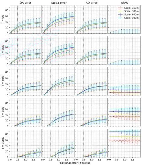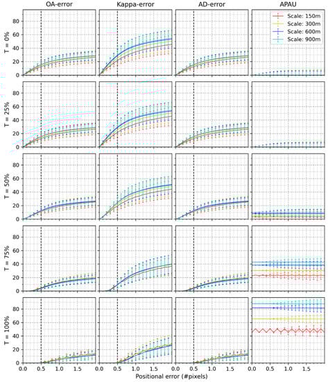 Figure 3 shows the mean and standard deviation of , , , and  (abandoned percentage of assessment units) of the 12 study sites at the four spatial scales and using the eight class classification scheme. The  was not presented because its values are zero regardless of the positional errors, spatial scales, and thresholds because simulating positional errors between classification maps and its reference data did not alter the proportions among classes. Figure 3 consists of twenty sub-figures, divided into five groups by rows or four groups by columns. Each row represents a specific labeling threshold (T). The first three columns denote the , , and , respectively, while the last column signifies the . There are four curves representing different scales in each sub-figure. The results found in Figure 3 are detailed below.
