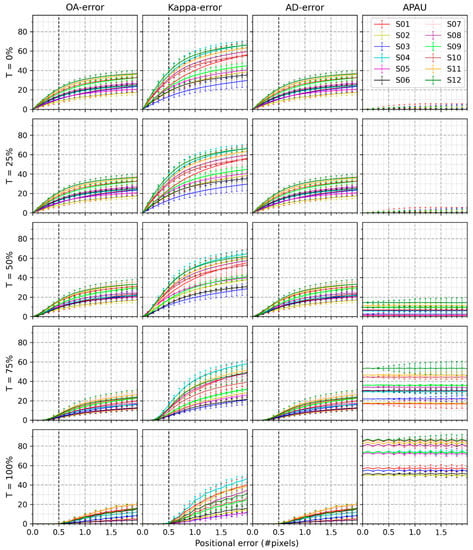 - When the positional error is 0.5 pixels, and T is no more than 50%, , , and are higher than 10%. When the threshold is 75%, and lie between 3.69% and 4.72% while the lie between 8.65% and 9.60%. Nevertheless, over 23.73% of assessment units were abandoned, and the maximum percentage approximates 42.98%. If T is 100%, the , , and drop to 0%, but reaches over 50.72%, and the highest reaches 87.90%.