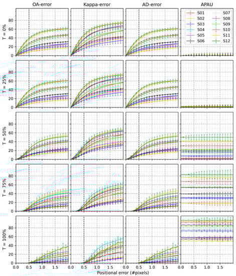 - The upper-left sub-figure shows that the resulted from positional errors ranging from 0 to 2.0 pixels when T is 0%. Generally, the curve of a study site with a smaller LSI is lower than that of a study site with a larger LSI. For example, the line of study site #5 with an LSI of 367.1 is below that of study site #12 that has an LSI of 438.5. However, this is not true for all study sites. For example, study site #1 holds the minimum LSI (Table 3), yet its line is above that of study site #5.