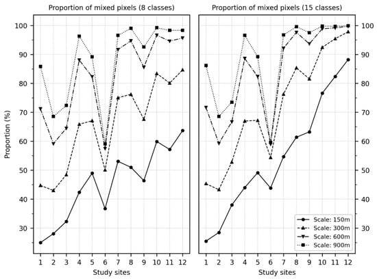 The proportion of mixed pixels of twelve study sites at different spatial scales.