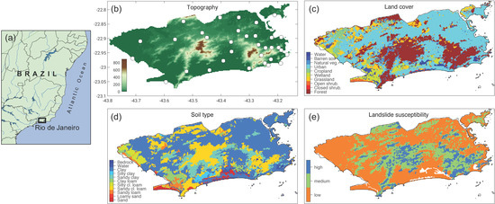 Figure 1. Study area/geographic location, and land surface datasets available for Rio de Janeiro city: (b) topography, (c) land cover, (d) soil type and (e) landslide susceptibility maps. The spatial distribution of pluviometric stations is also provided in panel (a).