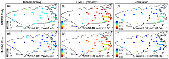 Figure 2. Daily bias, root mean square error (RMSE) and correlation for IMERG Early (ac) and IMERG Final (df) at 33 pluviometric stations for 2001–2019 wet seasons (November-April). Limits of Rio de Janeiro city are defined by the black line.