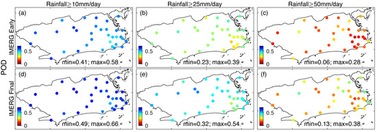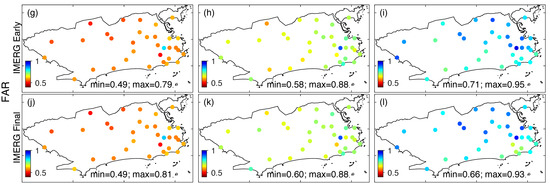 Figure 3. Probability of detection (POD) and false alarm rate (FAR) maps at three rainfall thresholds (≥10 mm/day, ≥25 mm/day and ≥50 mm/day) for IMERG Early (ac,gi) and IMERG Final (df,jl) at 33 pluviometric stations for 2001–2019 wet seasons.