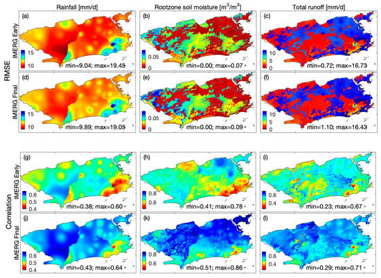 Figure 5. Spatially distributed RMSE and correlation of absolute rainfall, rootzone soil moisture and total runoff estimates over 2001–2019 wet seasons. Results are shown for experiments with IMERG Early (ac,gi) and IMERG Final (df,jl).