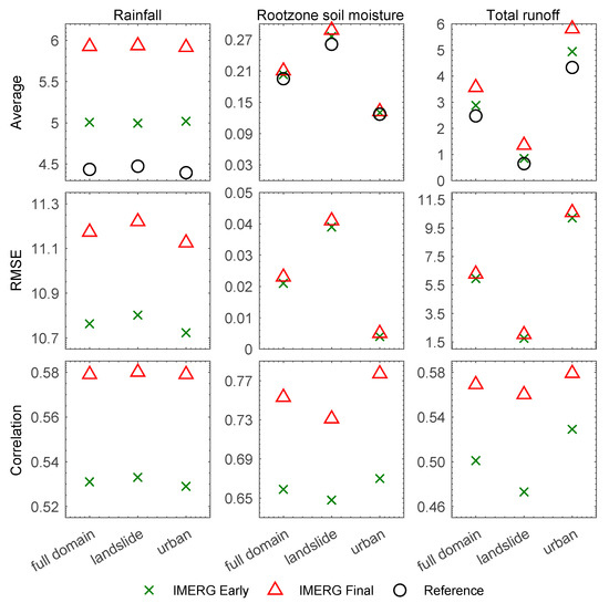 Figure 6. Average, RMSE and correlation of precipitation, rootzone soil moisture and total runoff derived from experiments using ground-based, IMERG Early and IMERG Final precipitation estimates. Results are shown as medians for 2001–2019 wet seasons over the full domain, and landslide-prone and urban areas. Average and RMSE units are mm/day for rainfall and total runoff, and m3/m3 for rootzone soil moisture.