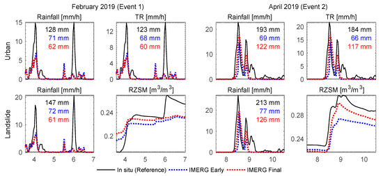 We selected two major storms to further evaluate the potential of IMERG in detecting natural disaster triggers in urban areas. They occurred on 5–7 February 2019 (Event 1) and 9–10 April 2019 (Event 2) and resulted in floods and landslides, causing major socio-economic damage in the city. Figure 7 shows hourly rainfall from the reference and IMERG products and their impact on TR over urban and RZSM over landslide-prone areas for both events. In Event 1, two rainfall peaks are observed two days apart, reaching 15 mm/h. Although the first one was detected by IMERG, both satellite products underestimate the total rainfall by about half. The second peak is missed by IMERG, showing smaller rainfall events distributed over 24 h instead. Over urban areas, the total observed rainfall during Event 1 was 128 mm, as opposed to a much lower amount of 71 and 62 mm detected by IMERG-E and IMERG-F, respectively. Such low IMERG-based rainfall rates resulted in 45–51% TR underestimation. Over landslide-prone areas, the reference experiment shows two consecutive RZSM raises within 2 days, occurring during each rainfall peak and totalling a soil moisture increase of 65%. The soil saturation caused by the second raise occurred in 6–7 February concomitant with the surging of numerous landslides over the city [45]. High RZSM levels derived from IMERG-based experiments at the beginning of Event 1 are explained by an early storm detected by IMERG, peaking ~10 mm/h, but not observed (not shown). As a result, the low rainfall peak was enough for RZSM to reach the reference level at the end of the first peak, but not to rise to the maximum reference moisture at the end of the second peak. Event 2 was characterized by a 2-day-long storm, totalling 201 mm of rainfall across the city (193 mm over urban areas and 213 mm over landslide-prone areas), with 183 mm during the first 24 h. This storm had three peaks with decreasing magnitudes over time. Both satellite products successfully detected the two major ones, but IMERG-F performed better, with a total rainfall of 122 mm, as opposed to 69mm with IMERG-E. The underestimated rainfall resulted in 36–64% lower TR over urban areas. Although slightly underestimated, soil moisture signals were properly represented, in particular by IMERG-F rainfall. The results obtained for these two cases suggest that, although IMERG products overestimate the average rainfall across the city, some severe storms might still be underestimated.