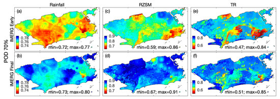 Figure 8. Probability of detection (POD) and false alarm rate (FAR) maps for rainfall (a,b), rootzone soil moisture (RZSM) (c,d) and total runoff (TR) (e,f) events derived from experiments with IMERG Early and IMERG Final at the percentile threshold 70% chance of occurrence.