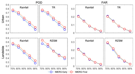 Figure 9. Median POD and FAR for rainfall, rootzone soil moisture (RZSM) and total runoff (TR) rates derived from IMERG-E and IMERG-F experiments at percentile thresholds of ≥70%, ≥80%, ≥90%, ≥95% and ≥98% over the urban and landslide-prone areas.
