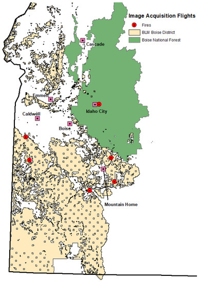 As for the data used in this research, this study utilized a set of fire data from previous similar research efforts. The wildfire burn areas used in this study are a collection of medium to large size fires in southwestern Idaho ranging from xeric sagebrush steppe fires located within the United States Department of Interior Bureau of Land Management Boise District to the mesic upper Payette and Boise River watersheds in the United States Department of Agriculture Forest Service Boise National Forest. The naming schema for these fires, as displayed in Table 1, are usually determined by a nearby notable landmark such as a creek or a hill. For example, the Hoodoo fire burn area burned near and across the Hoodoo Creek near Idaho City, Idaho. Typically, these names were the official names of these fires assigned by the local jurisdiction and used by dispatchers. The locations of the burned areas of which acquisition flights were conducted are shown in Figure 1.