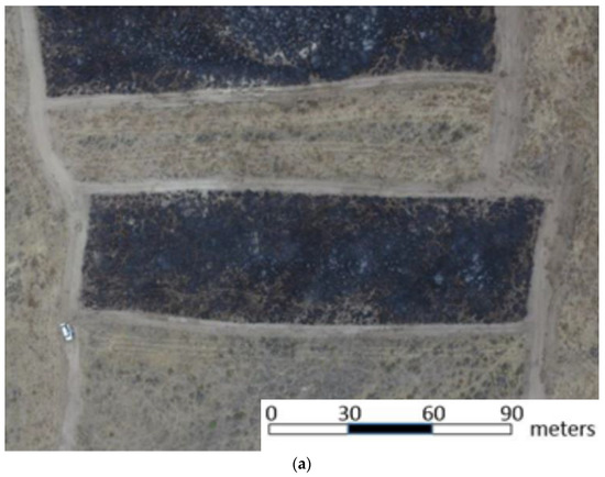 Aerial imagery for this project was acquired with a DJI Phantom 4 with a 12-megapixel color camera. The imagery acquired with the sUAS was taken while flying at an altitude of 120 m above ground level (AGL), giving the photos a spatial resolution of 5 cm per pixel [9]. Objects that are wider than that pixel resolution will be discernible in the acquired hyperspatial imagery as shown in Figure 2a. The black rectangles in the image are burned areas. Small lines and patches of white within the burned area are white ash from sagebrush which was fully combusted by the fire. The unburned vegetation consists primarily of annual and perennial grasses and forbs, Wyoming big sagebrush (Artemisia tridentata spp. Wyomingensis), and yellow rabbitbrush (Chrysothamnus viscidiflorus). The scene shown in Figure 2 contains two western juniper trees (Juniperus occidentalis spp. occidentalis).