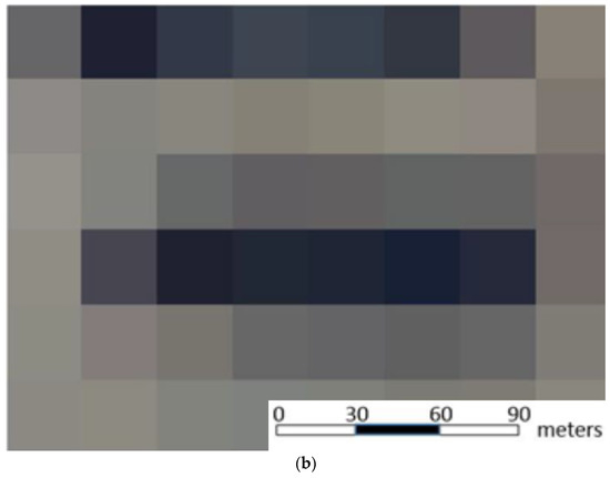 (a) Image of a rangeland study area acquired with a Phantom 4 sUAS flying at 120 m AGL with a spatial resolution of 6 cm per pixel. (b) Same scene resampled to 30 m resolution with six rows and eight columns of pixels [22].