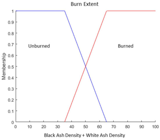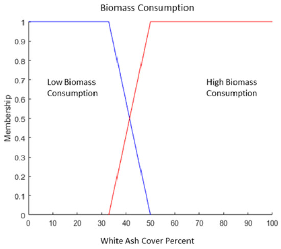 An additional set membership was used that measured biomass consumption, which evaluated the relationship between the density of black ash and white ash. The white ash cover was expressed as a percentage of white ash to burned (white and black ash) pixels, transitioning between low and high biomass consumption over a transition from 33% to 50% [19,23], as previously shown in Figure 4.
