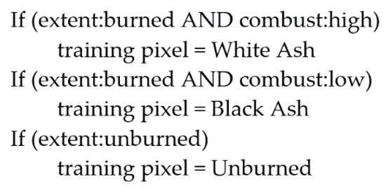 Fire biomass consumption needed to be only evaluated on the burn extent, and thus any white ash detection outside of the burned boundaries was disregarded. This filter could be applied using fuzzy logic to fuzzy set membership, a fuzzy AND is expressed as taking the minimum value of the expressions on either side of the AND operator. Likewise, a fuzzy OR is expressed as taking the maximum value of the expressions on either side of the OR operator. When evaluating a series of fuzzy IF statements, as previously shown in Figure 5, the data are defuzzified by selecting for activation the action associated with the IF expression with the highest value.