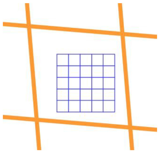Before resampling the resolution of the training image, acquired with an sUAS, from hyperspatial resolution to satellite medium resolution, such as is acquired by the Landsat Satellite project, preprocessing and imagery alignment is required to establish alignment with the smaller pixels and the larger medium resolution image pixels. The first alignment step reprojects the imagery so the hyperspatial image and the medium resolution image have the same spatial reference. In Figure 6, the projection for the medium resolution image (orange) and the hyperspatial sUAS image (blue) have different spatial references, making the pixel boundaries misaligned between the two images.