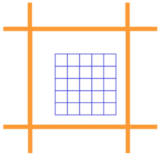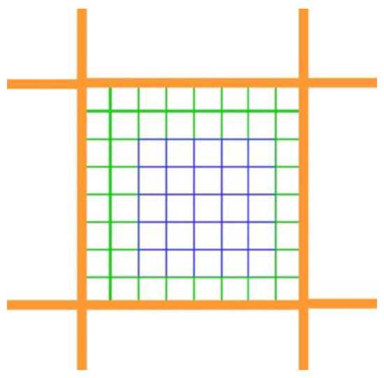 Once the pixel boundaries are aligned between the hyperspatial and medium resolution images, the medium resolution image is cropped so it only contains pixels that overlap the hyperspatial image. At that point, the extent of the hyperspatial image does not correspond to pixel boundaries, as is shown by the white space between the blue pixels and the boundary of the overlapping orange pixel in Figure 6. The extent of the hyperspatial image needs to be expanded out to the edge of the clipped medium resolution image. Additional rows and columns of null pixels are added around the hyperspatial image using OpenCV, expanding the extent of the hyperspatial image until it corresponds to the pixel outer pixel boundaries of the overlapping medium resolution pixels, which are shown in green in Figure 8.