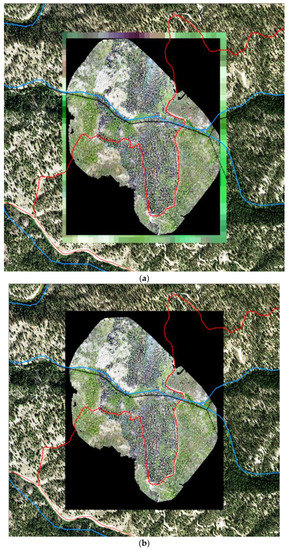 (a) sUAS orthomosaic rendered on top of clipped Landsat image; (b) sUAS orthomosaic with a buffer of null pixels giving it the same extent as the clipped Landsat image. Red polylines represent roads and trails. Blue polylines represent creeks. Black hatched polyline represents a historic railgrade.