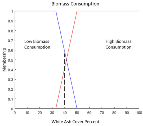 Biomass Consumption Fuzzy Set Membership. With 40 percent White Ash Cover denoted by the dotted line, there is 0.41 membership in High Biomass Consumption and 0.59 membership in Low Biomass Consumption.