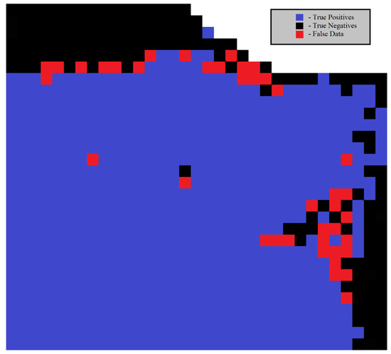Once the SVM finished classifying, an output image of the entire satellite scene was produced. A simple testing program was developed to analyze the SVM’s accuracy when it mapped burn extent and severity on a satellite. Once the data was normalized, all the pixels were compared with the training data, and the equation shown in Equation (2) was applied to determine the accuracy of the SVM’s burn extent.