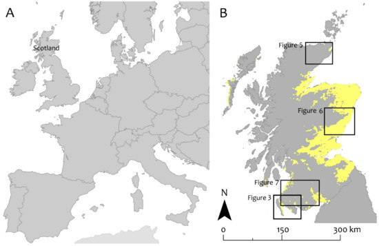 (A) The location of the study area in north-west Europe. (B) Map of Scotland, with yellow tone indicating the generalised extent of arable ground, which is a specific focus of interest for repeat imaging. The locations of Figures 3, 5, 6 and 7 are shown, referring to issues discussed below.