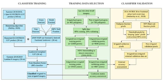 This study used multiple imagery sources to develop a map of irrigated vs. non-irrigated vegetation at a 30 m spatial resolution in SoCAB, which covers urban and non-urban areas of Los Angeles, a Mediterranean megacity with diverse and heterogeneous landcover. We determined that training a random forest classifier with a combination of Landsat 8 RGB-NIR/NDVI imagery (30 m) and a weighted sharpened ECOSTRESS LST (30 m) with a fractionally aggregated high-resolution urban vegetation map (0.6–10 m) produced a map of irrigated and non-irrigated vegetation cover in SoCAB with an overall accuracy of 98.2%. Future work will utilize this map to improve urban carbon and water cycle models, as well as tracking urban irrigated land use change as longer-term LST imagery becomes available from ECOSTRESS.