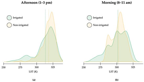 35]. The more-anisohydric irrigated vegetation is able to maintain photosynthesis under high temperatures due to increases in soil moisture supply, thus leading to increased evaporative cooling of LST in the afternoon.